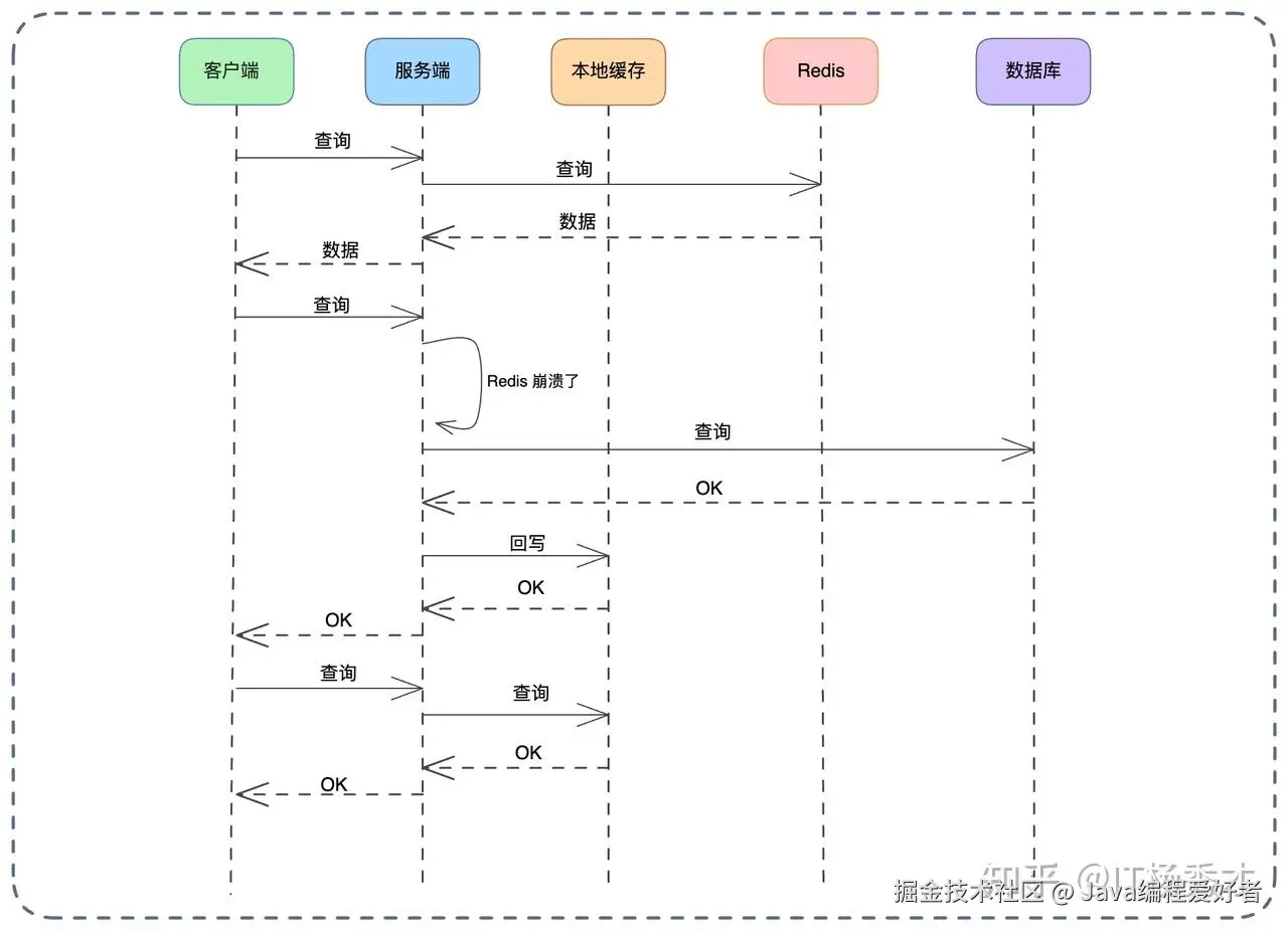 这个方案听起来似乎“反其道而行之”,因为通常我们是先查本地再查 Redis。但在这个场景下,本地缓存的作用是保护数据库。想象一下,当 Redis 突然不可用,成千上万的 QPS 瞬间击穿到数据库,数据库必死无疑。而启用本地缓存,虽然可能会面临数据时效性的问题(数据可能是旧的),但它能挡住绝大部分流量,保住数据库,让系统“活下来”。