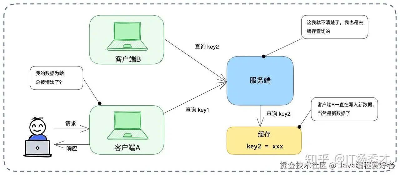 客户端缓存最大的痛点是感知不到数据变更。如上图所示,其他客户端修改了数据,服务端更新了,但当前客户端缓存里还是旧值。