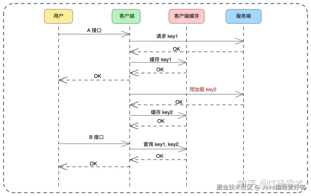 我们在处理“提交订单”接口时,除了完成订单创建逻辑,还可以异步地发起微服务调用,将该订单的支付详情、优惠券信息、支付渠道配置(图中的 Key2)等数据提前查询并放入缓存。 当用户真的跳转到“支付页面”调用接口 B 时,数据已经在缓存里等着了,用户会感觉页面跳转极其顺滑,系统响应极快。