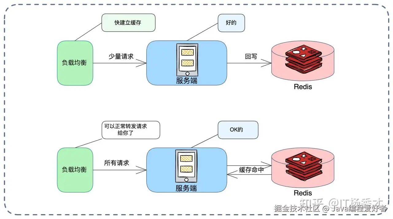 冷启动阶段(图示上方流程):新节点刚启动时,将其权重调低(比如少量请求),只让它分配到少量流量。