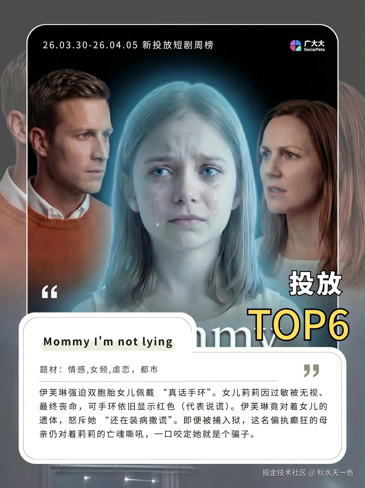《Mommy I'm not lying》位列周榜总榜第31名、创意数去重后约1.2K。本剧与国内热度不错的“真话手环”类型漫剧相似,都有父母偏心要素,并以家庭矛盾作为主要看点。
