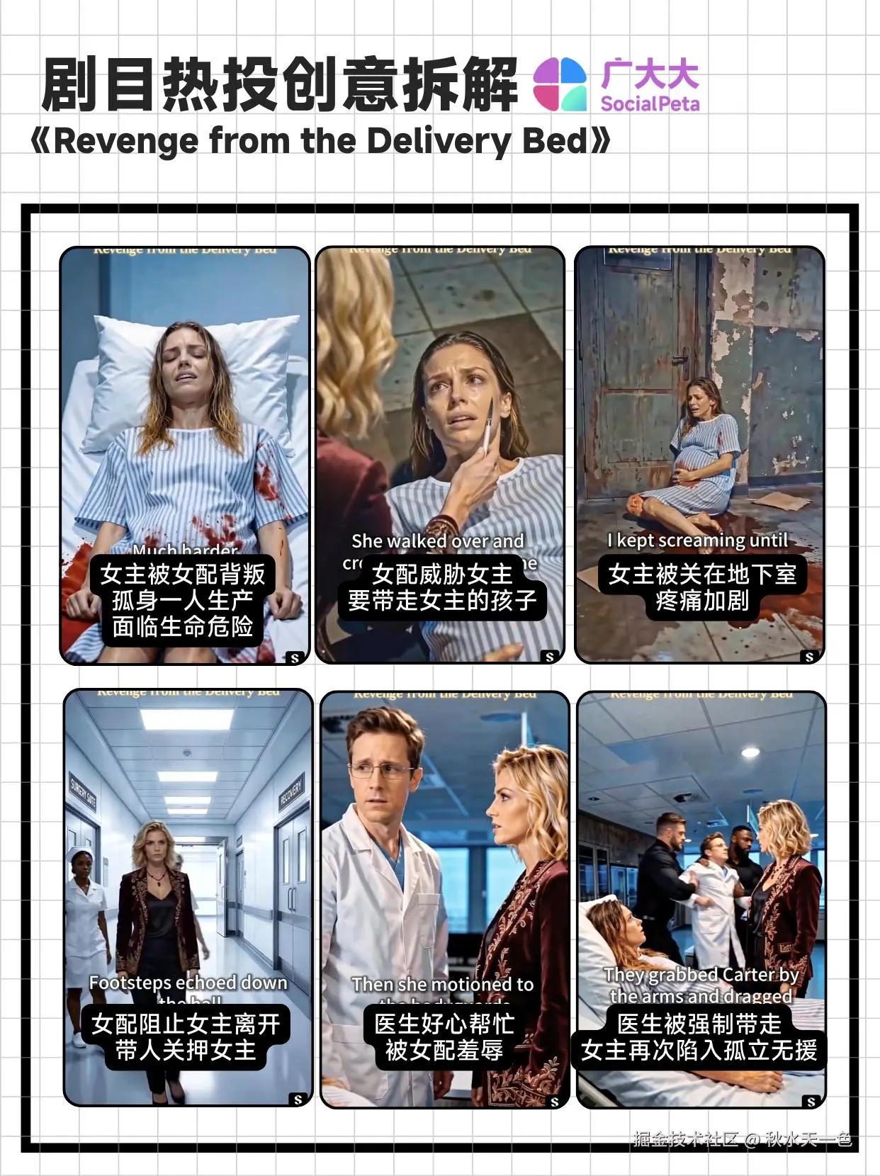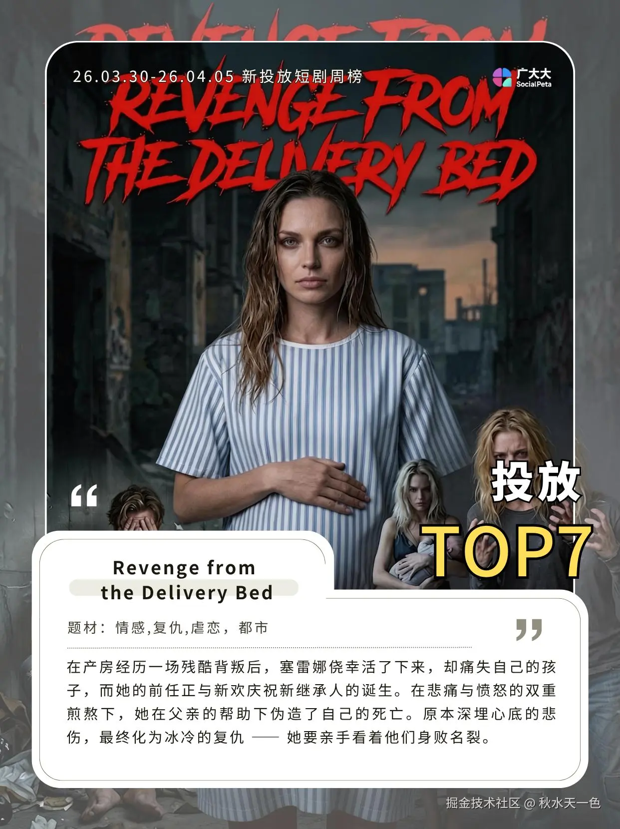 《Revenge from the Delivery Bed》在周榜总榜上排名第32,投放素材约1.2K,展现估值达1.7KW。该剧主要讲述女主在产房分娩之际,却因为女配和渣男的背叛,生产突发意外身临险境,被父亲救下后,女主开始了步步为营的复仇大戏。