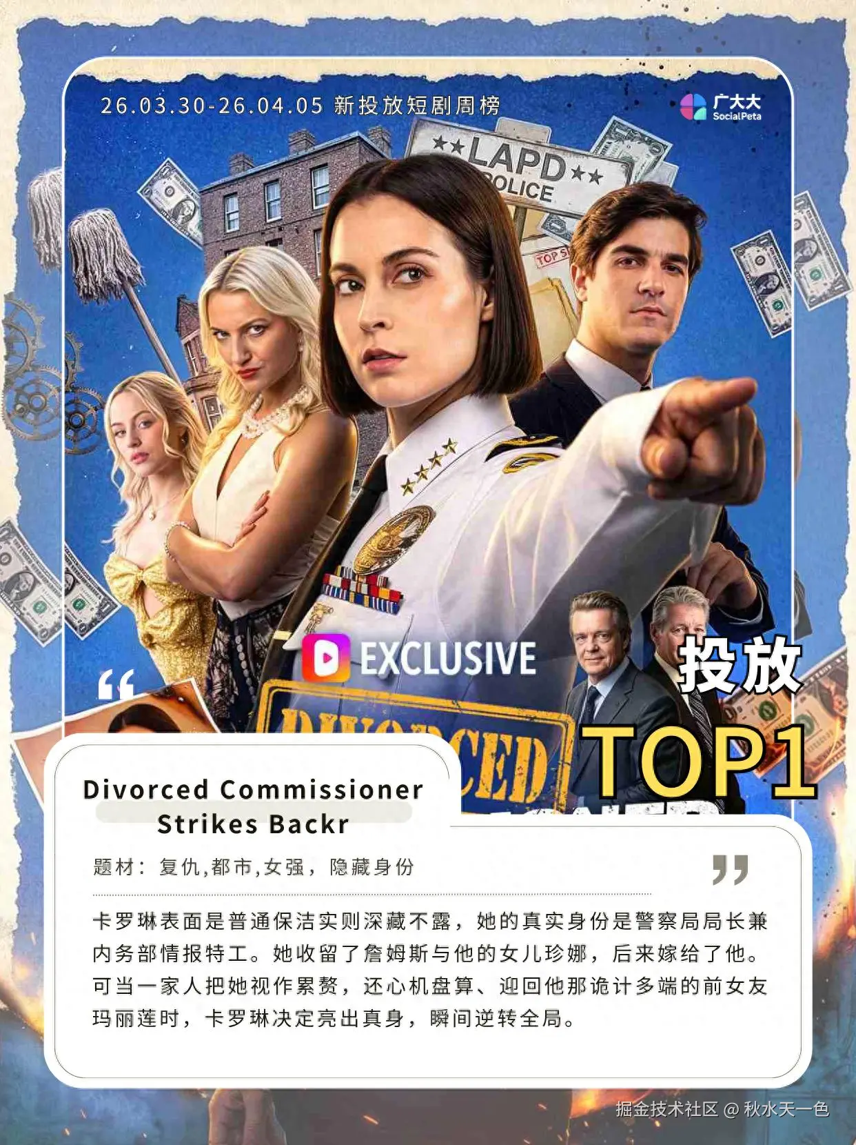 《Divorced Commissioner Strikes Back》周榜总榜排名第13名,投放素材去重后约为2.2K条,展现估值达到3.2KW。