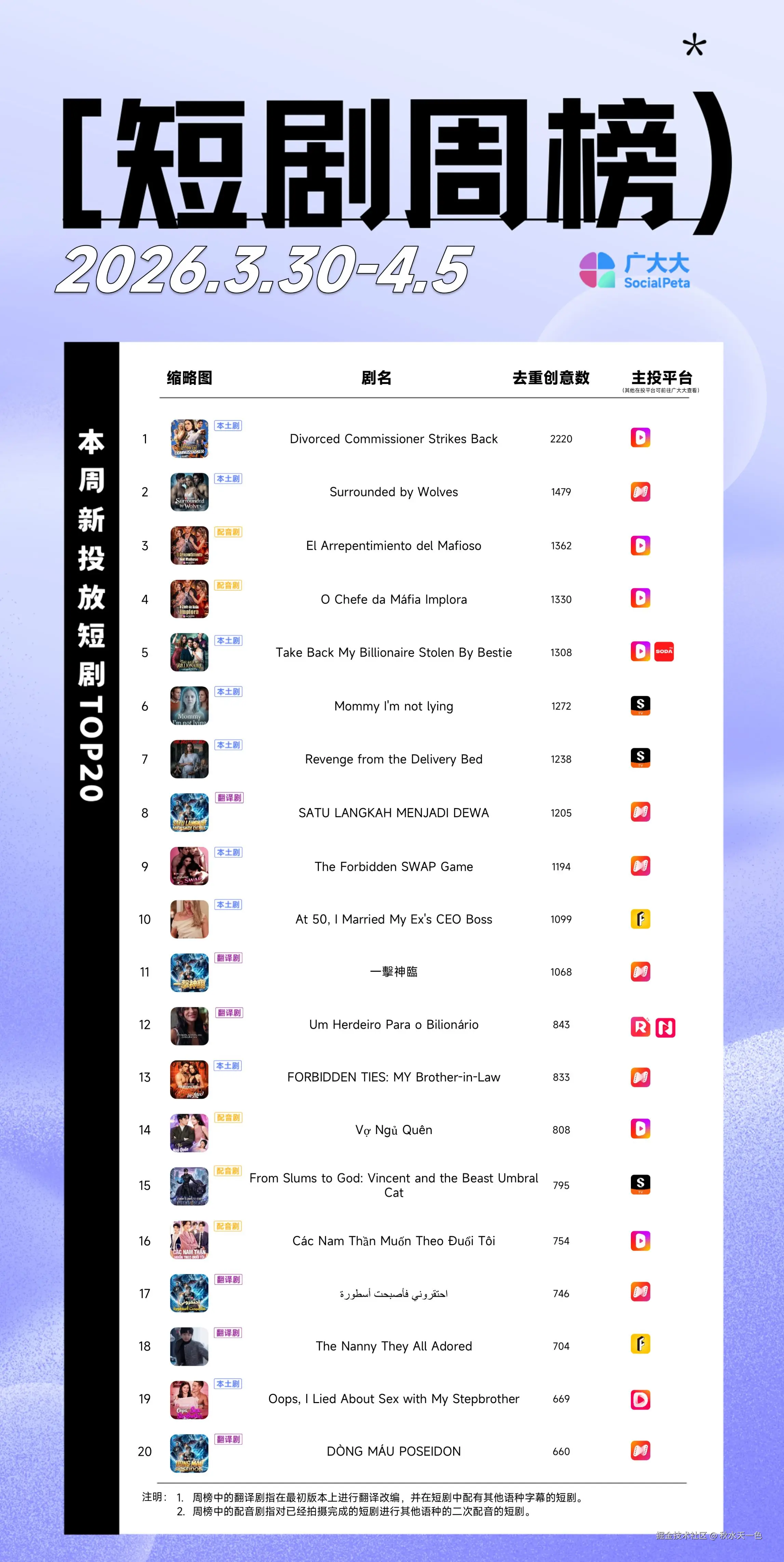 广大大发布26.03.30 - 26.04.05 新投短剧周榜: