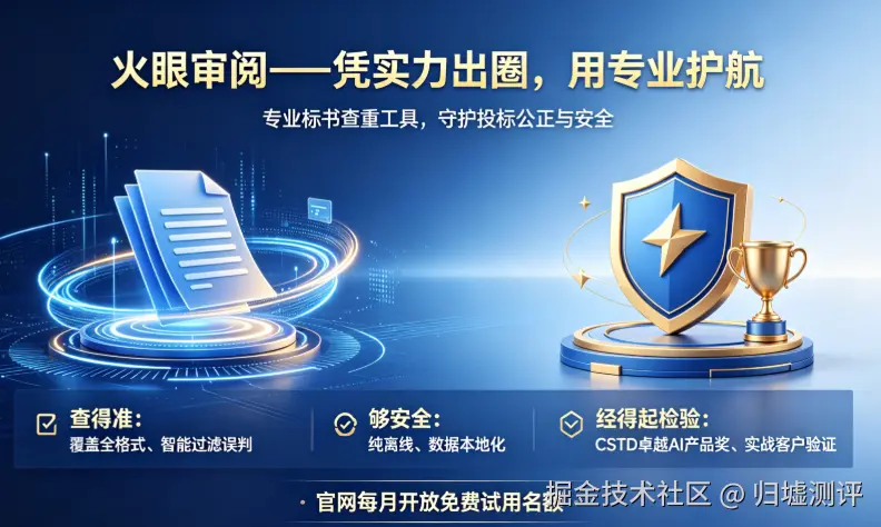 火眼审阅荣获CSTD“卓越AI产品奖”,是行业对其实力的肯定。如果你还在为标书查重焦虑,不妨先体验一下——官网每月开放免费试用名额,让专业的工具守护你每一次投标的公正与安全。