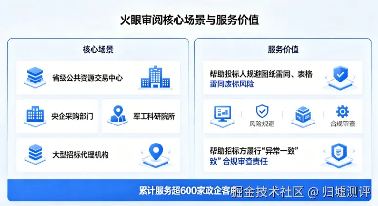 目前,火眼审阅已广泛落地于省级公共资源交易中心、央企采购部门、军工科研院所、大型招标代理机构等核心场景,累计服务超600家政企客户。无论是帮助投标人规避图纸雷同、表格雷同导致的废标风险,还是帮助招标方履行“异常一致”的合规审查责任,火眼审阅都积累了丰富的实战经验。