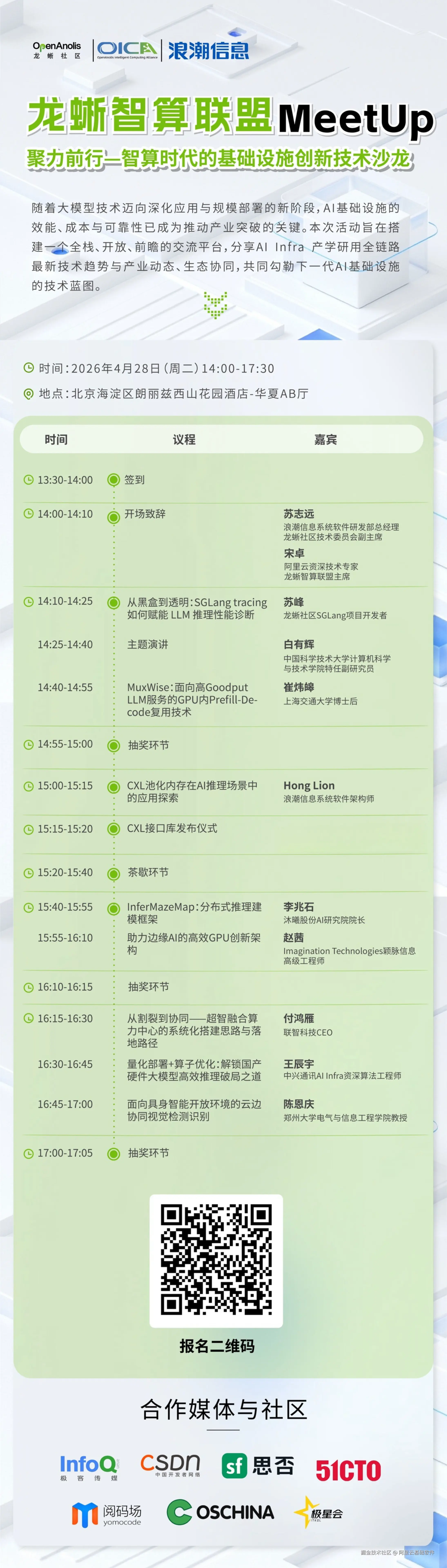随着大模型技术迈向深化应用与规模部署的新阶段,AI 基础设施的效能、成本与可靠性已成为推动产业突破的关键。4 月 28 日,由龙蜥智算联盟主办、浪潮信息承办的以**「聚力前行—智算时代的基础设施创新」**为主题的 MeetUp 将在北京举办。本次活动聚焦 AI Infra 产学研用全链路最新技术趋势与产业动态,涵盖 LLM 推理性能诊断、GPU 复用技术、CXL 池化内存应用、分布式推理建模框架、边缘 AI 高效 GPU 架构等热点话题,从技术原理到落地实践,全方位解析 AI 基础设施创新路径。