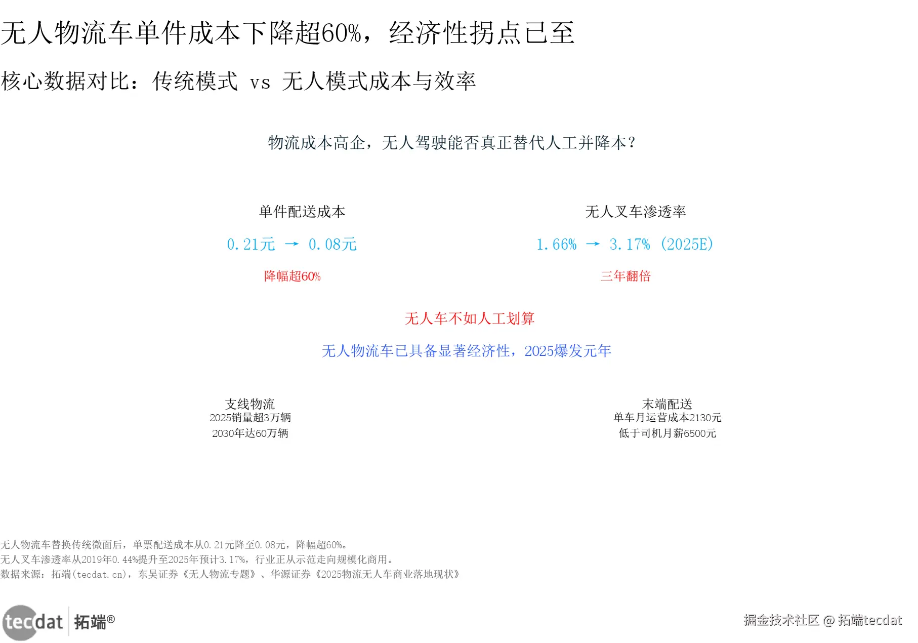 分析:这张图直接回答物流人最焦虑的问题——“无人驾驶到底能不能真降本?”左侧:单件配送成本0.21元→0.08元,降幅超60%;右侧:无人叉车渗透率1.66%→3.17%,三年翻倍。中间红叉否定“无人车不如人工划算”的错误认知。底部左右分栏用具体场景数据(支线物流2025销量超3万辆、末端配送月运营成本2130元 vs 司机月薪6500元)证明经济性。核心信息:成本拐点已到,不需要再观望。
