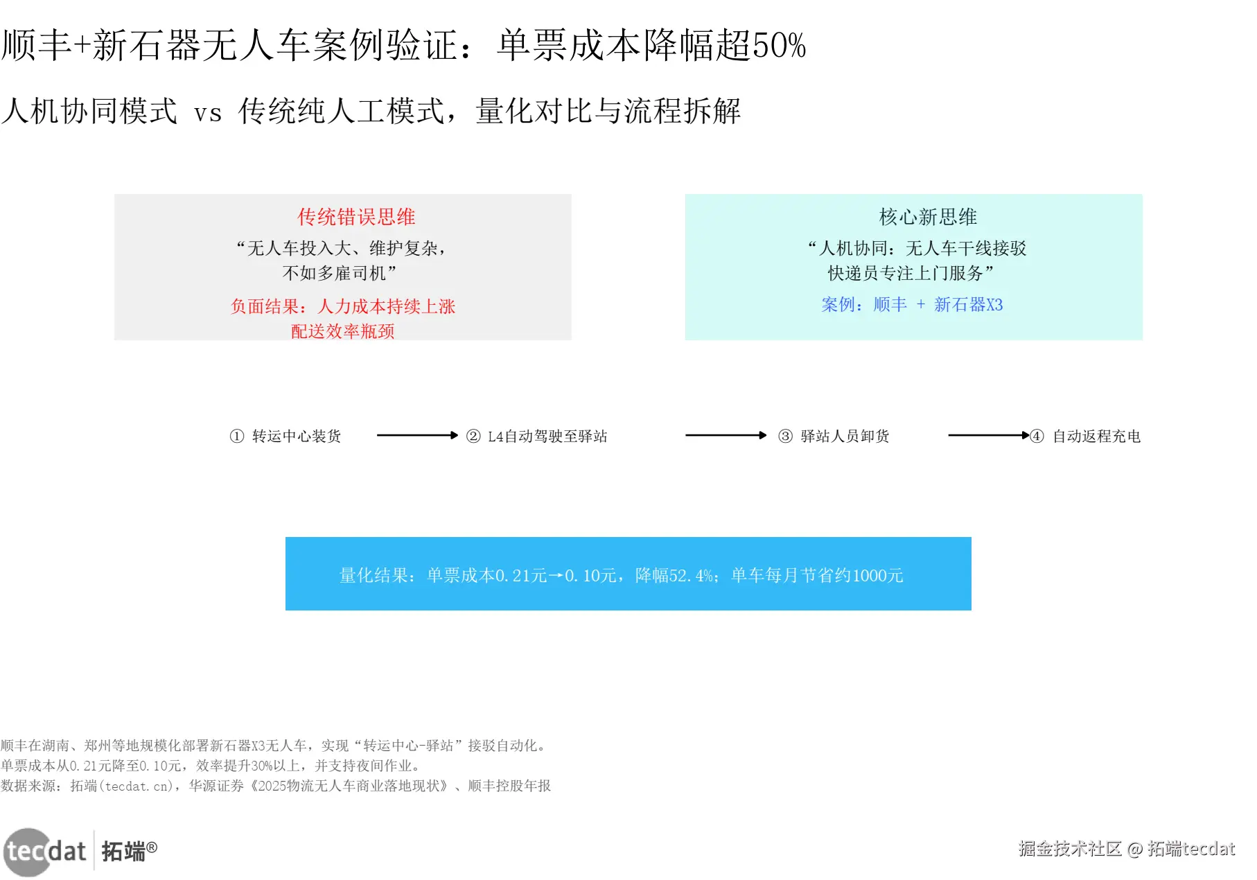 分析:左右对比结构验证“人机协同”模式。左侧传统思维——“无人车投入大、维护复杂,不如多雇司机”,结果人力成本上涨、效率瓶颈。右侧核心新思维——“人机协同:无人车干线接驳,快递员专注上门服务”,以顺丰+新石器X3拆解4步流程:转运中心装货→L4自动驾驶至驿站→驿站人员卸货→自动返程充电。底部量化结果:单票成本0.21元→0.10元,降幅52.4%,单车每月节省约1000元。这不是空谈理论,而是已被头部企业验证的可复制流程和真实收益。
