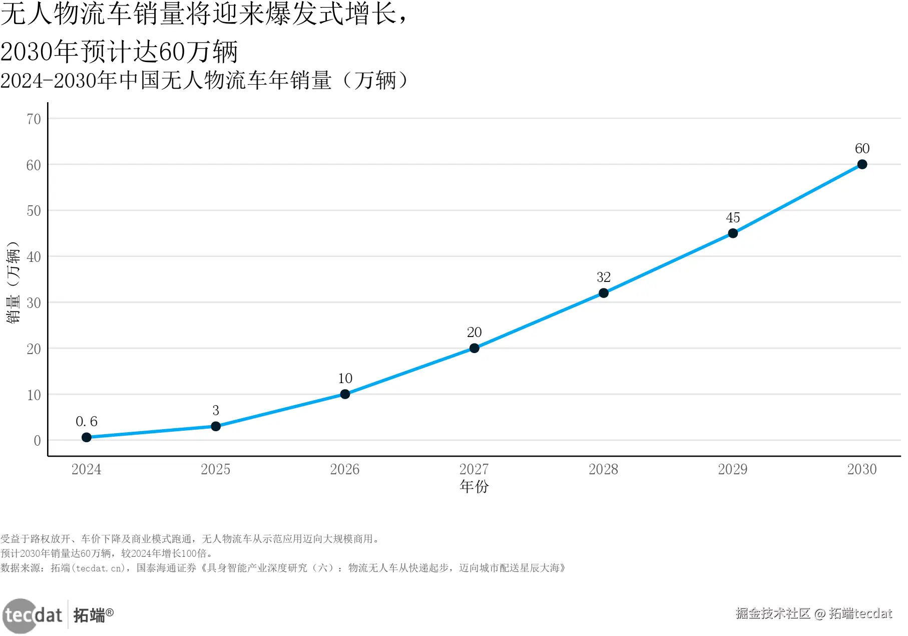 国泰海通证券预测,2024年中国无人物流车销量仅0.6万辆,2025年将飙升至3.26万辆,2030年达到60万辆。这个增长曲线的陡峭程度,与十年前智能手机普及率爆发如出一辙。