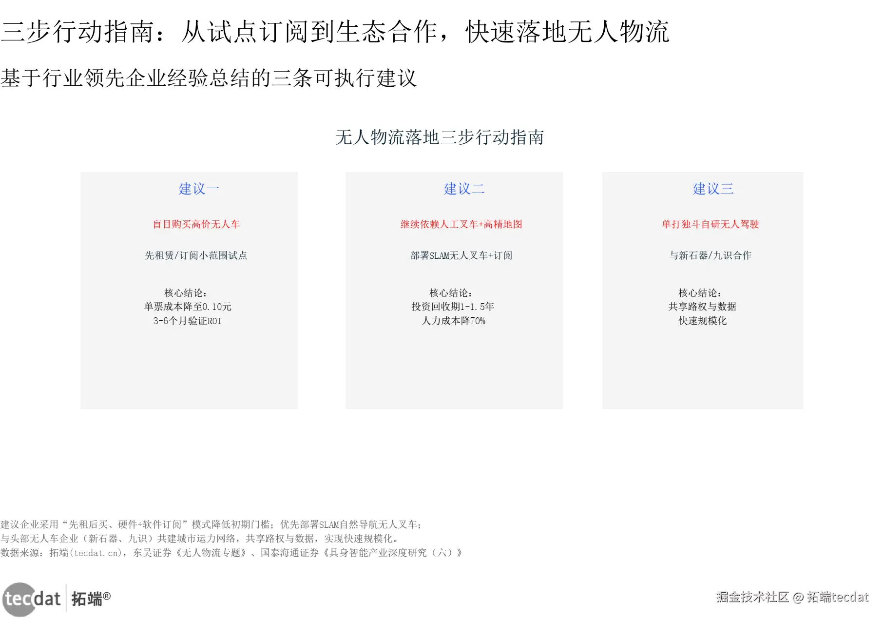 分析:这张图将全文分析浓缩为三条可立即执行的行动建议。每条遵循“否定错误做法→明确正确方向→核心结论”结构。建议一:不要盲目购买高价无人车,先租赁/订阅试点,3-6个月验证ROI,单票成本0.10元。建议二:不要再依赖人工叉车+高精地图,部署SLAM无人叉车+订阅,投资回收期1-1.5年,人力成本降70%。建议三:不要单打独斗自研无人驾驶,与新石器/九识合作,共享路权与数据,快速规模化。适合截图保存,作为企业引入无人物流的第一步检查清单。
