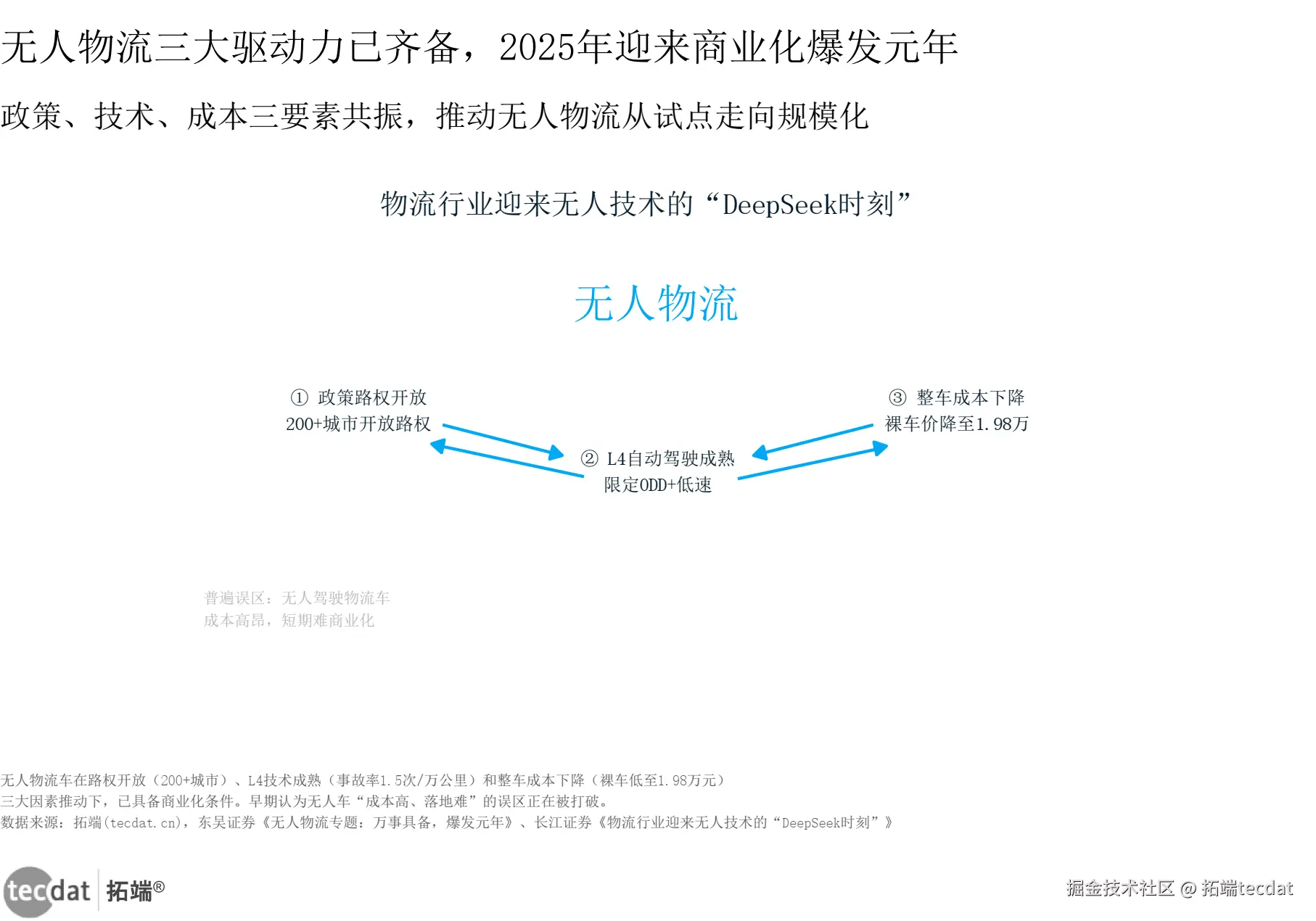 分析:这张图用闭环箭头揭示了无人物流车爆发的三大驱动力——政策路权开放(200+城市)、L4技术成熟(事故率1.5次/万公里)、整车成本下降(裸车1.98万元)。三要素形成正向循环:路权让企业敢投入,技术降低了事故风险,成本让网点算得过账。角落“成本高昂、短期难商业化”的误区被三个箭头同时否定——行业已跨过示范试点,进入规模化前夜。