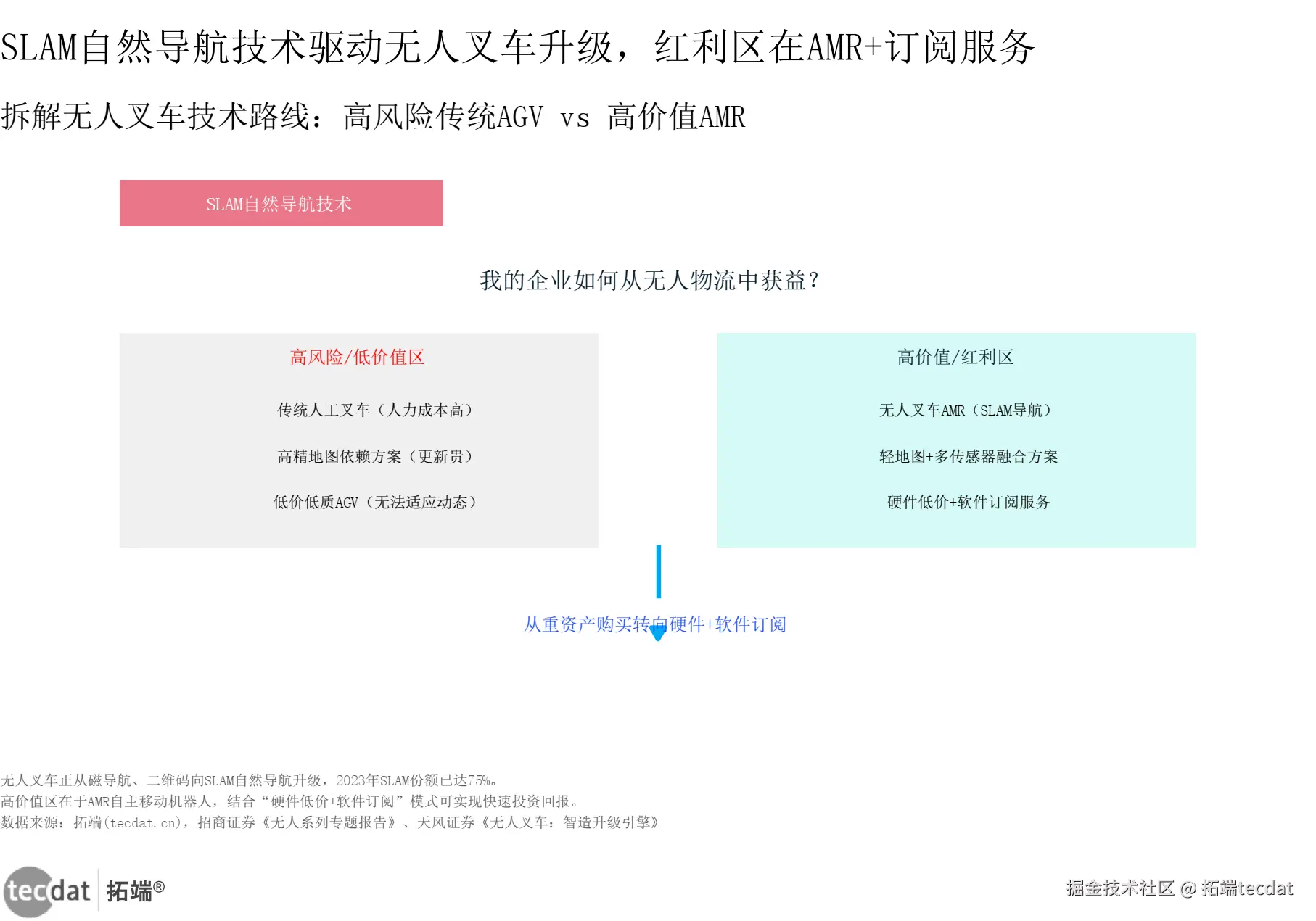分析:这张图聚焦“如何选对技术路线”。左上角红框标注核心概念“SLAM自然导航技术”,中心问题是“我的企业如何获益?”左右分栏给出答案:左侧高风险区——传统人工叉车、高精地图依赖方案、低价低质AGV;右侧高价值区——无人叉车AMR、轻地图+多传感器融合、硬件低价+软件订阅。底部箭头指明方向:从重资产购买转向订阅制。中小企业主别再买需要预埋磁钉的旧款AGV,直接选择支持“轻地图+订阅制”的AMR供应商。