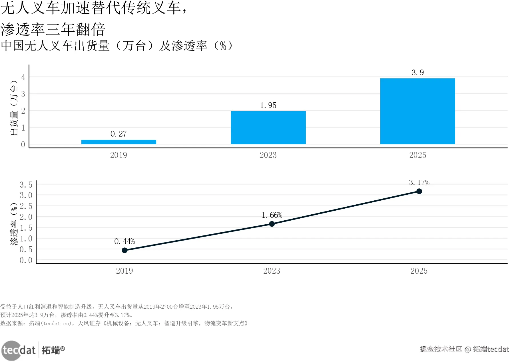 天风证券数据显示,中国无人叉车出货量从2019年的2700台增至2023年的1.95万台,渗透率从0.44%提升至1.66%,预计2025年将达3.9万台,渗透率3.17%。