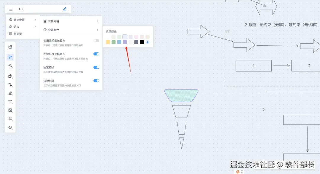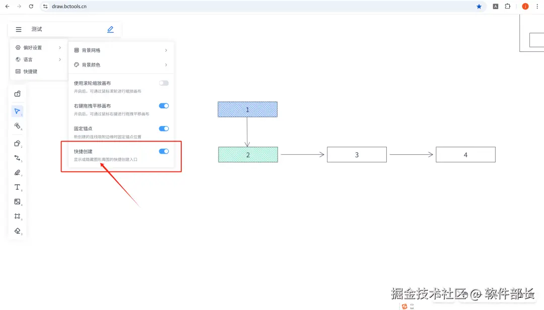 1、在偏好设置中,增加快捷创建的功能,快捷创建时为了在创建相同组件并排进行箭头连线时可以点击式创建