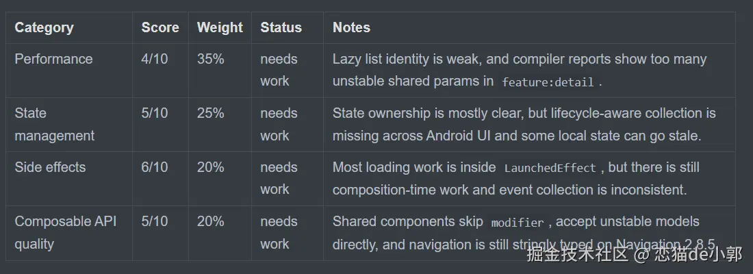 最近发现了一个非常不错的 Compose AI Skills 项目 compose_skill ,这个 Skills 可以针对你的 compose 项目生成一份评分的报告,例如下面就是我的 Compose 项目在这个 Skills 下得到的评分:
