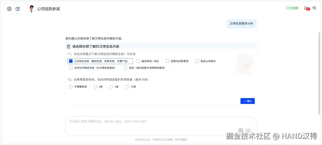 V2 版本内置动态表单收集功能,当分析发现缺少必要参数时,会自动生成结构化的表单向用户询问,支持多种输入类型(文本、日期、选择等),并自动生成选项供用户选择,让信息收集更高效、体验更友好。