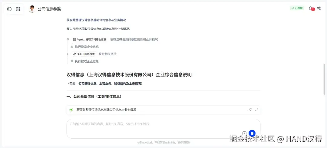 通过基于AutoAgent V2版本打造的“公司信息参谋”,只需输入公司名称,系统即可自动完成从信息收集到报告生成的全流程。 从需求输入到报告产出,全程由AutoAgent驱动,智能引导用户明确查询意图,自动完成全维度信息检索,并将结果深度整合为专业的企业研究报告,用户可一键导出为PPT,真正实现自主规划与执行。 [video(video-04hrBRaq-1775807125132)(type-csdn)(url-live.csdn.net/v/embed/520…)]