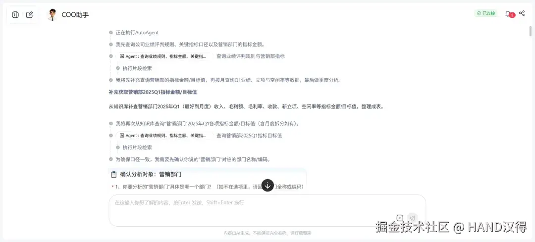 此前,汉得灵猿(大圣)AI中台推出的 AutoAgent 节点V1版本 ,通过基础自主规划能力,让智能体可根据目标拆解任务,实现了从 “人工编排” 到 “半自主执行” 的跨越,支持了企业的部分场景。