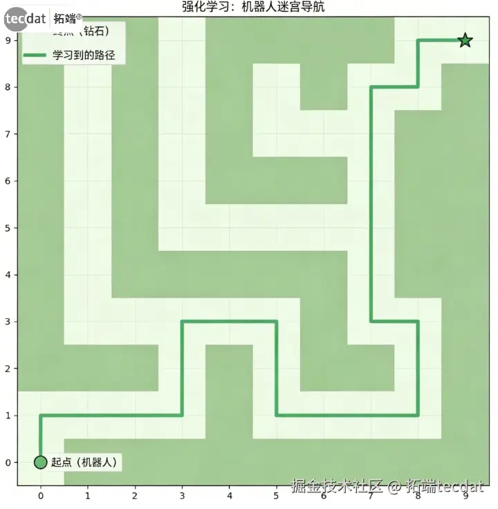 RL的核心思想围绕一个闭环交互展开:智能体观察环境的当前状态,根据其策略选择一个动作执行,环境随之转换到一个新的状态并返回一个即时的奖励。智能体的目标是学习一个最优策略,使得其在长期交互过程中获得的累积奖励总和最大。本文将通过一个具体的“迷宫寻路”案例,从零开始构建一个强化学习智能体,并深入讲解Q-Learning算法及其扩展——Deep Q-Learning。