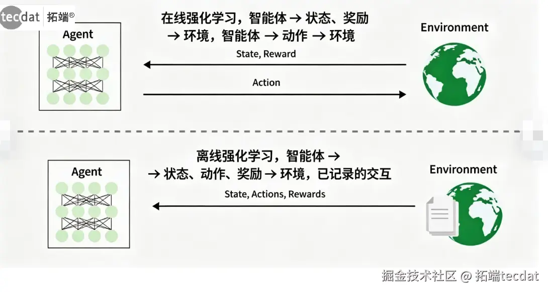 在线学习中,智能体通过实时与环境交互收集数据并同时学习;离线学习则基于预先收集的静态数据集进行训练,不与环境交互。