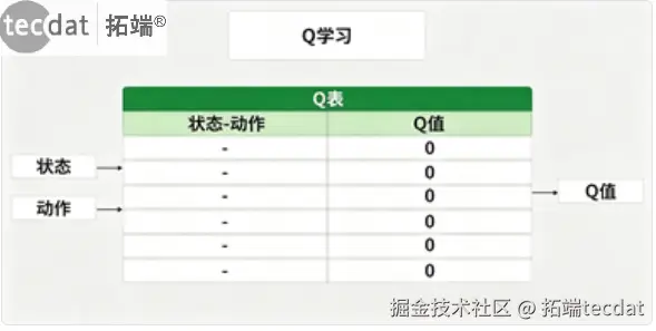 Q-Learning的核心是构建Q表,存储每个状态-动作对的期望累积奖励估计值。