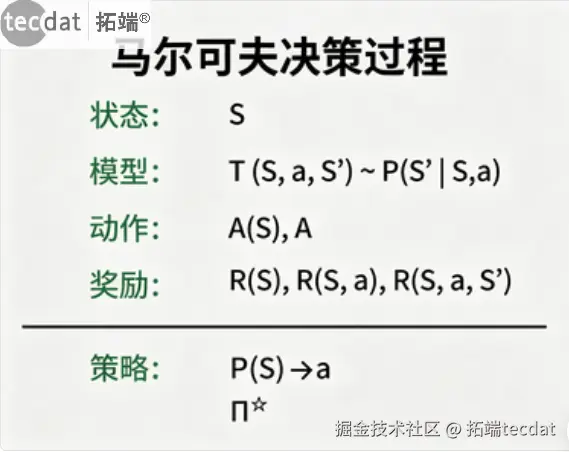 MDP是RL的数学框架,由状态、动作、转移概率、奖励、折扣因子五元组定义。