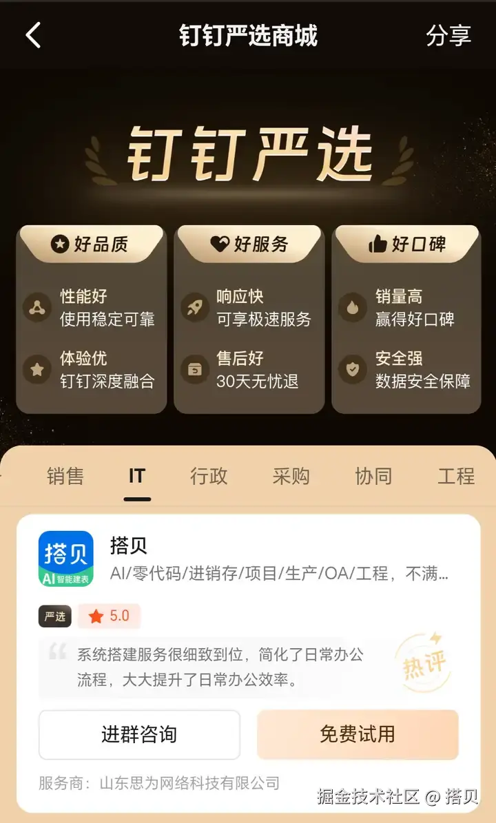 A1:搭贝是专注企业数智化转型的零代码AI应用搭建平台(低代码生态中的轻量化分支),也是 山东地区唯一入选钉钉严选的工具。它无需专业编程,通过拖拽操作就能完成企业级应用搭建,核心是让普通人也能参与数字化建设。
