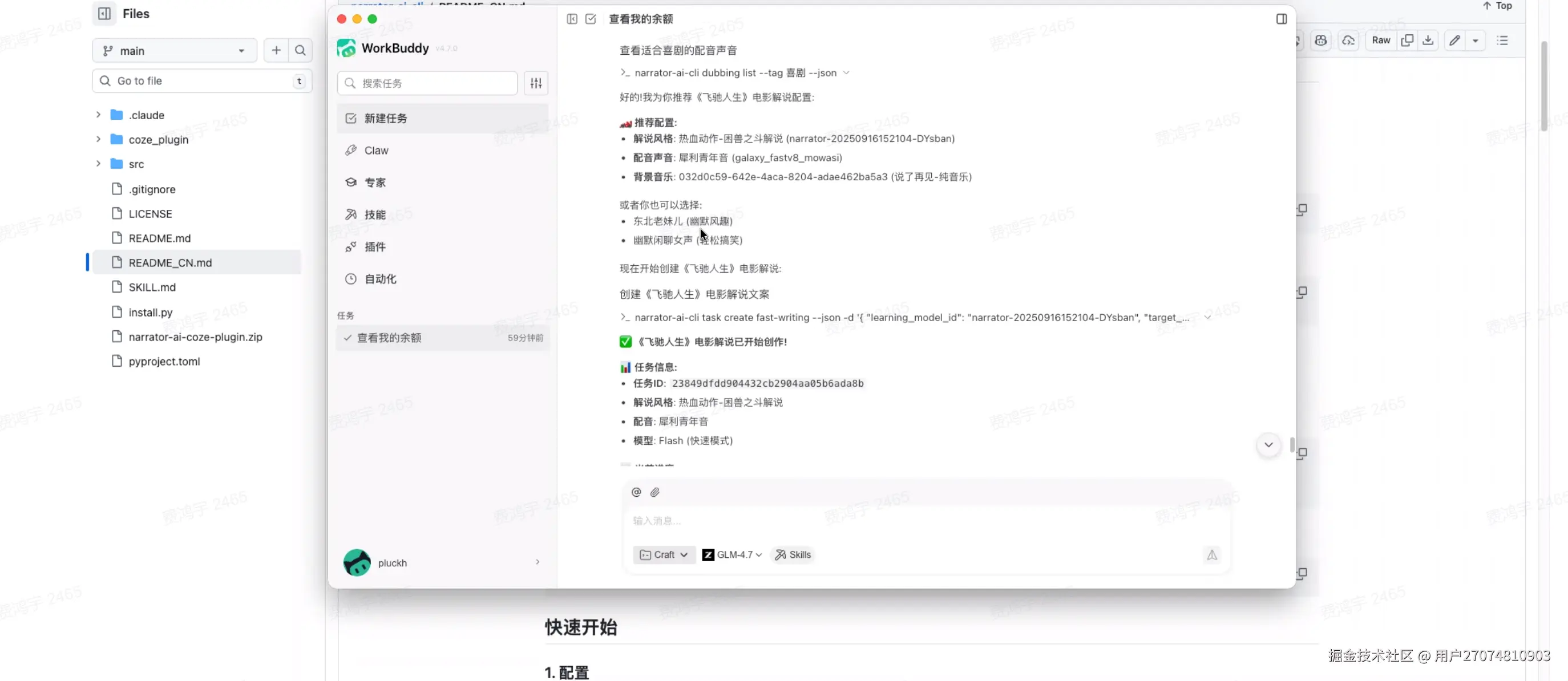 装完之后,你只需要对 AI 说"帮我做一个《飞驰人生》的电影解说视频",它会自动完成搜索素材、匹配风格、生成文案、合成视频的全流程,全程你只需要回复"确认"。