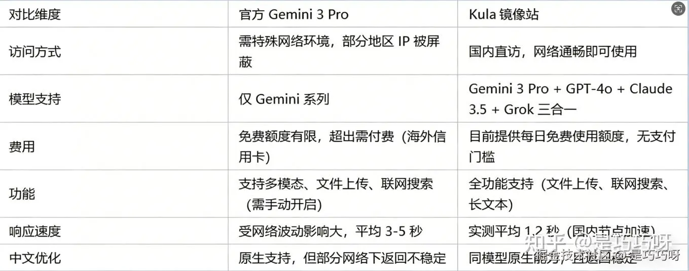 国内已有部分技术团队搭建了Gemini 3 Pro镜像站,其中kula因其稳定性、免费性和多模型聚合脱颖而出。下面通过对比表格直观展示:
