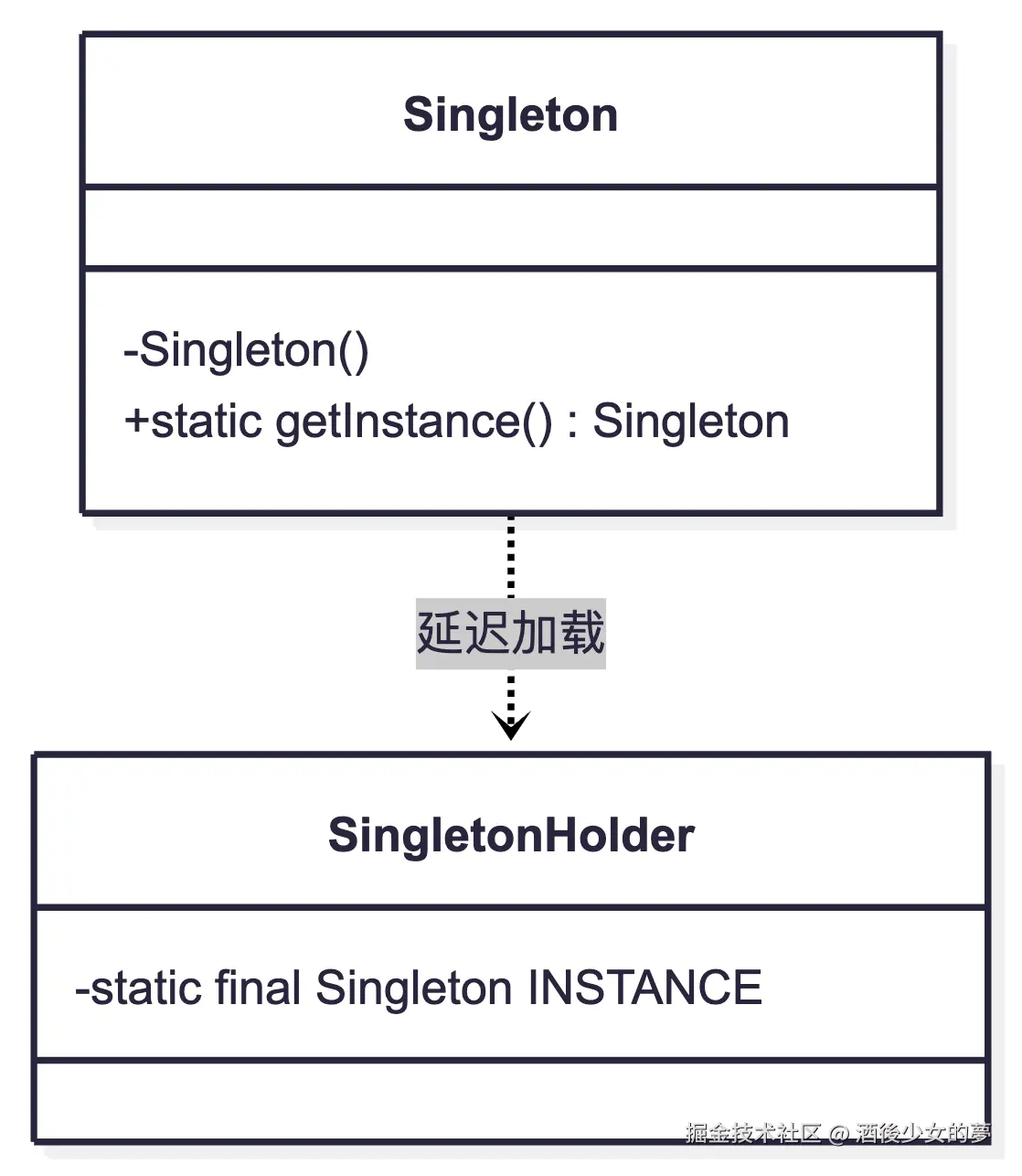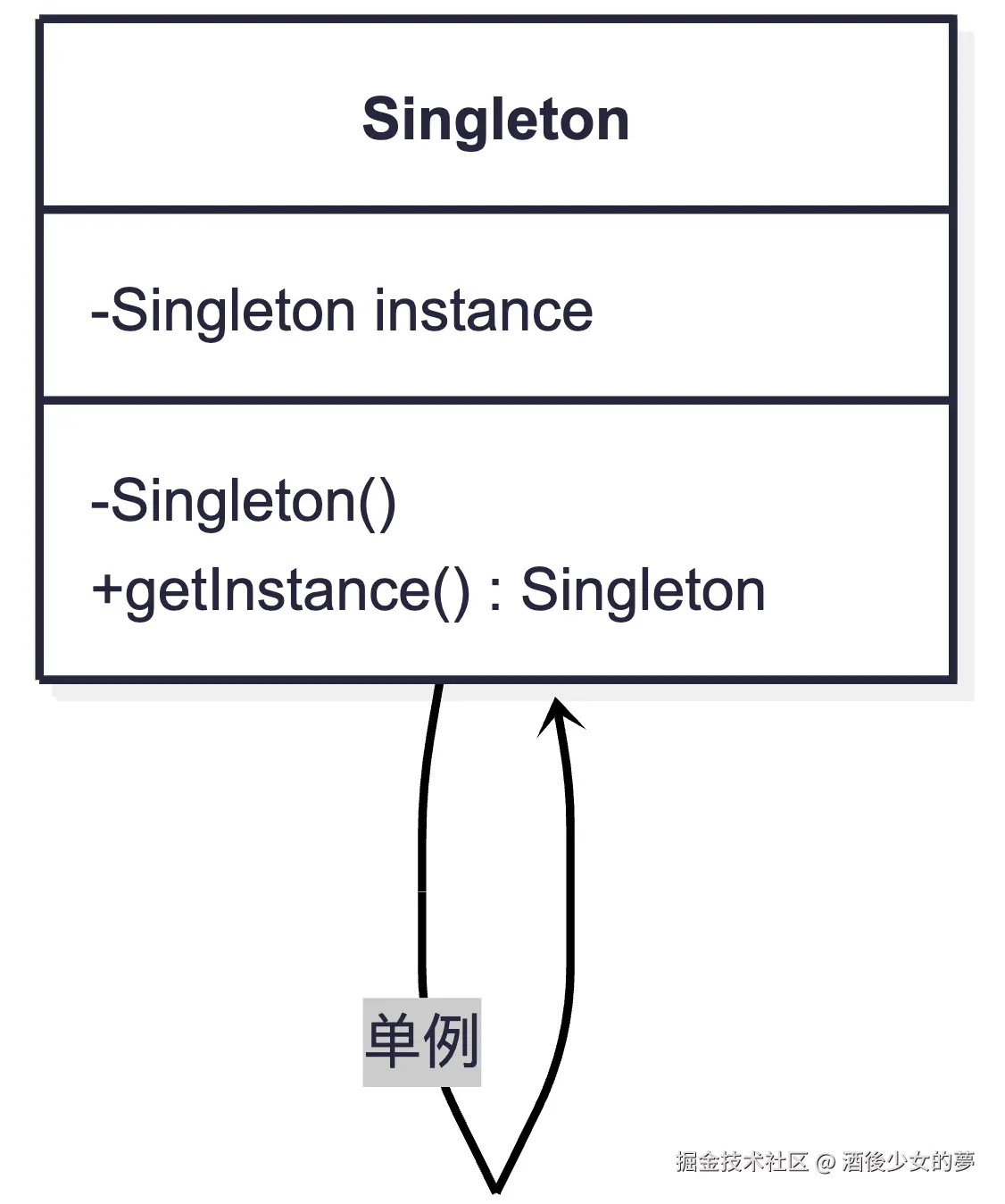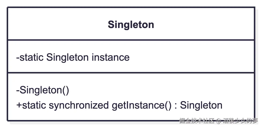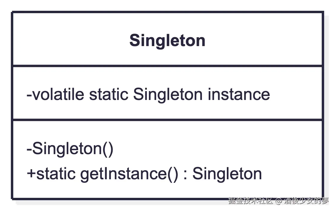 private static instance:持有唯一实例private Singleton():私有构造函数,防止外部 newpublic static getInstance():全局访问点