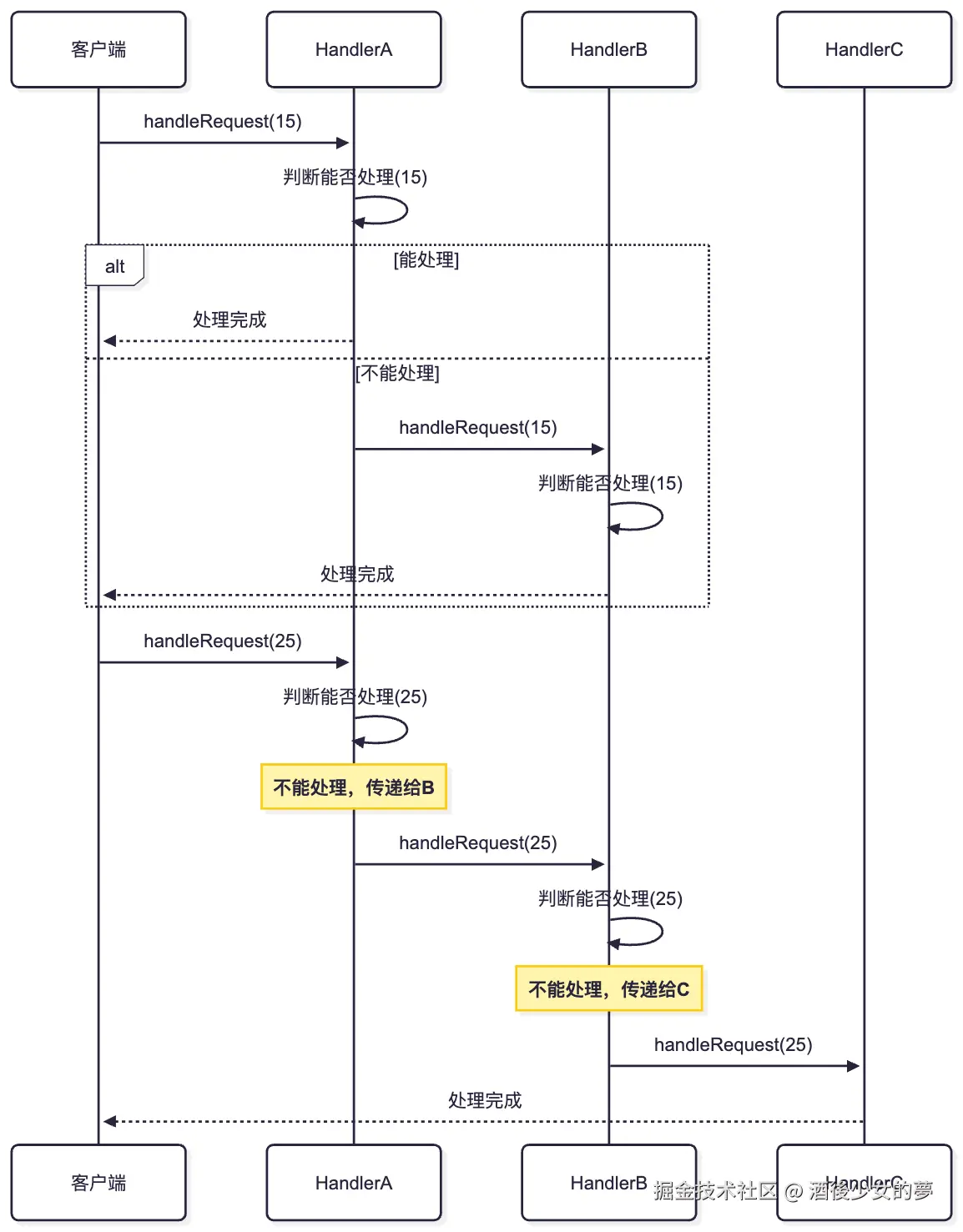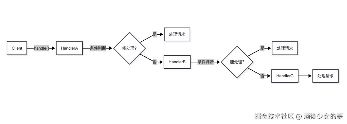 | 处理请求链 | 责任链模式 |
