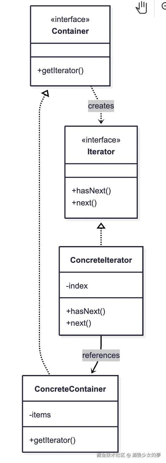 | 迭代器模式 | 顺序遍历,封装逻辑 | 统一遍历接口 |