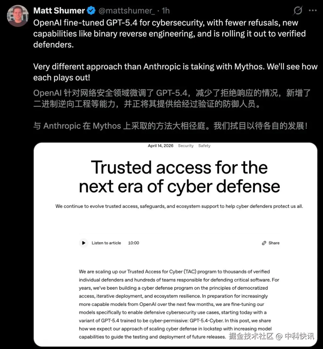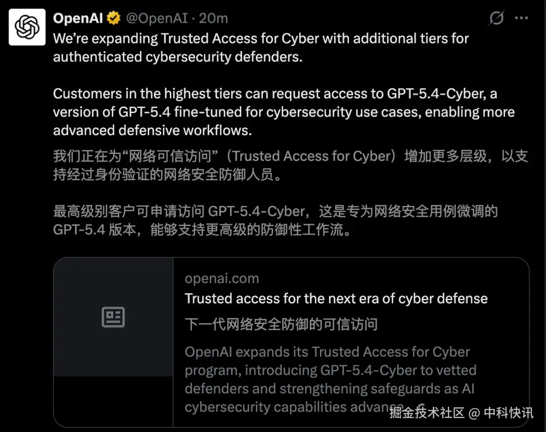 本周,科技界传来重磅消息:在Anthropic发布Claude Mythos预览版一周后,OpenAI正式祭出其安全防御领域的最新武器——GPT-5.4-Cyber。这款专门为安全防御微调的强力模型目前仅限通过身份验证的网络安全专家使用,旨在抢占AI安全防御的先机。