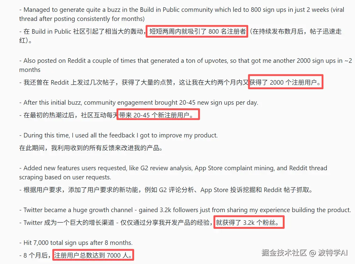 800 注册涌入后,他根据用户请求加了 G2 评价分析、App Store 投诉挖掘、Reddit 帖子抓取。产品越贴合需求,社区带进来的用户留存越高。