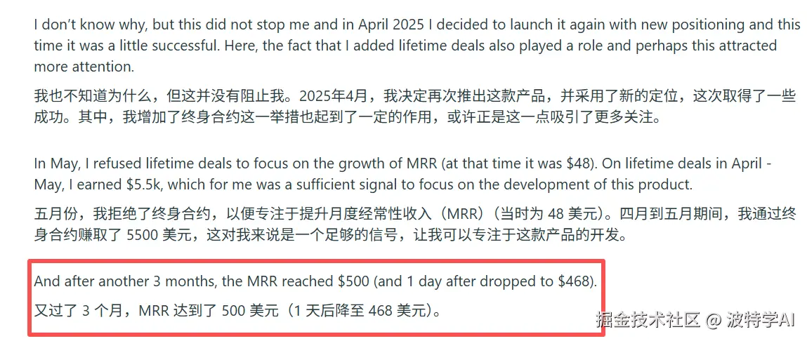 第三次是 2025 年 4 月,换了一套新定位,加上 lifetime deal 的策略,终于跑通了。LTD 两个月赚了 $5,500,给了他足够的信号:这个方向有人愿意买单。
