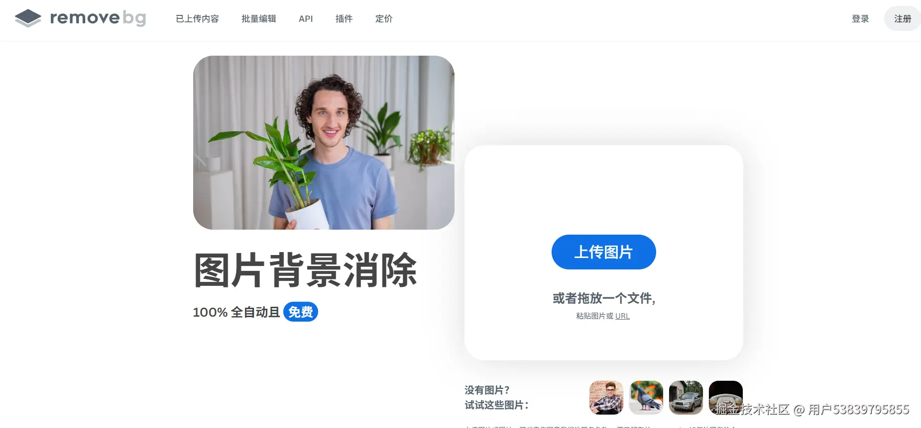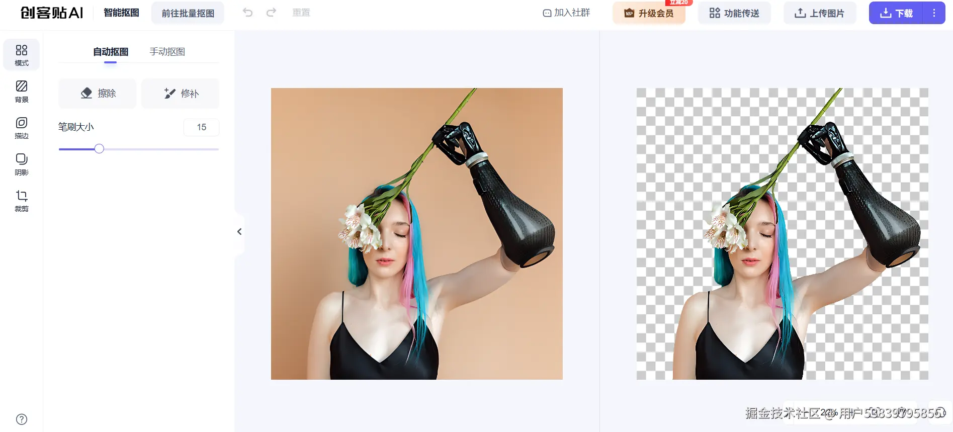 - 上传图片自动抠背景,支持人物、商品、动物,头发丝也能处理得比较干净。