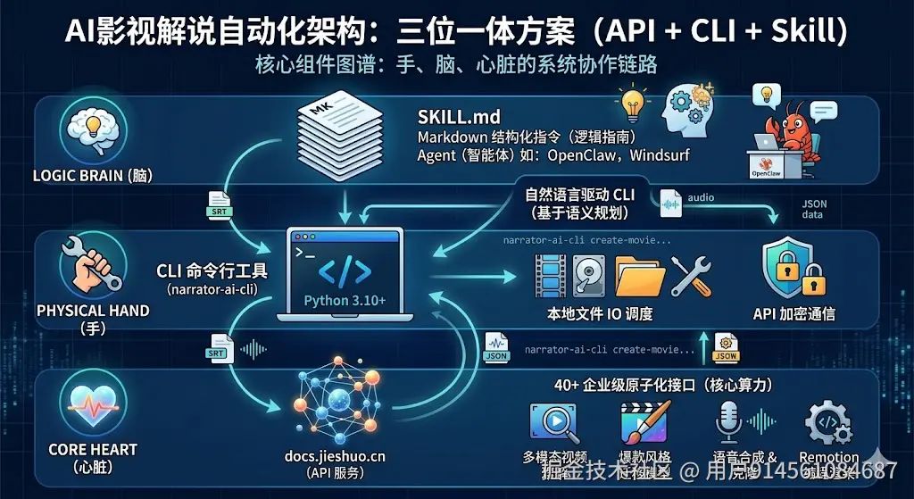 - narrator-ai-cli-skill: 采用结构化 Markdown 编写的智能体技能定义文件。它作为“逻辑指南”,允许具备命令行执行权限的 Agent(如 OpenClaw、Cursor、Windsurf 等)通过自然语言直接驱动底层 CLI。