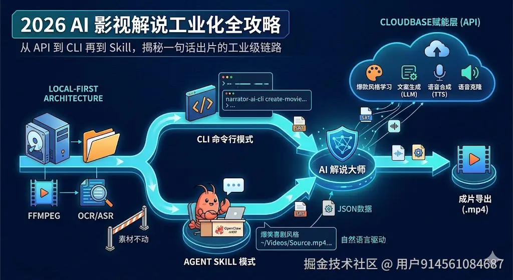 本文将分享一套基于 narrator-ai-cli 与 Skill 架构的自动化方案。该方案旨在通过一行命令或一段自然语言指令,打通从视频理解、文案生成到配音剪辑的完整闭环,实现影视解说场景的工业化落地。