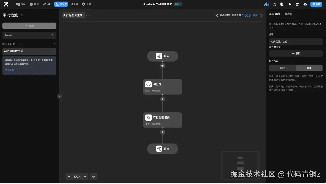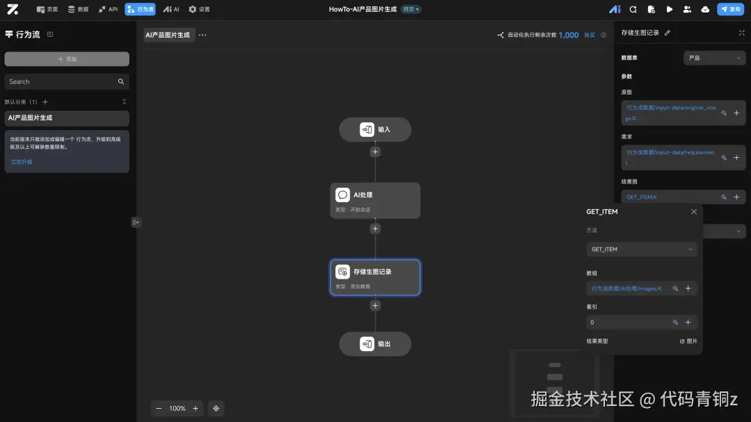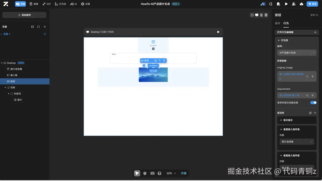 调用行为流:选择 AI产品图片生成。将图片选择器和文本输入框的值分别绑定到行为流参数。