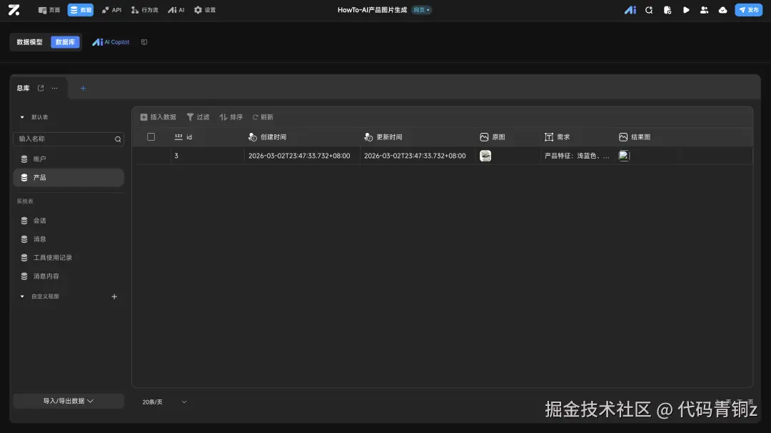 - 数据校验:进入数据库查看 产品 表,确认原图、需求描述和 AI 生成的结果图已正确保存。