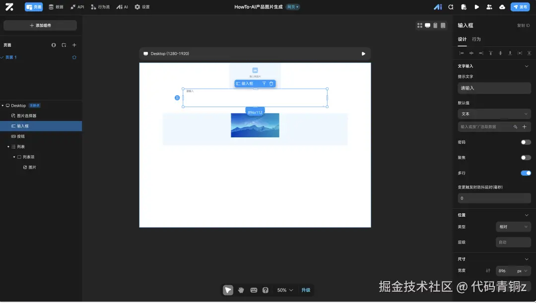 输入区域:拖入一个 图片选择器 (用于上传原图) 和一个 文本输入框 (用于填写需求)。在属性面板为文本输入框开启“多行”模式。