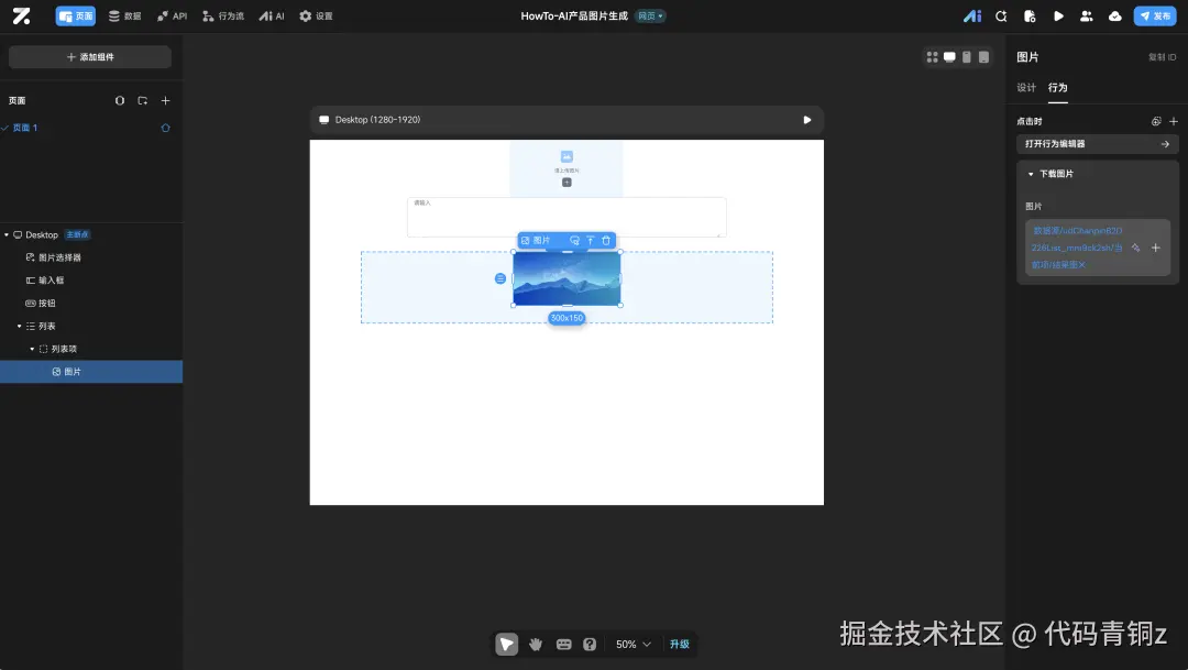点击交互:为该图片添加“下载图片”动作,目标图片同样绑定为 当前项.结果图。