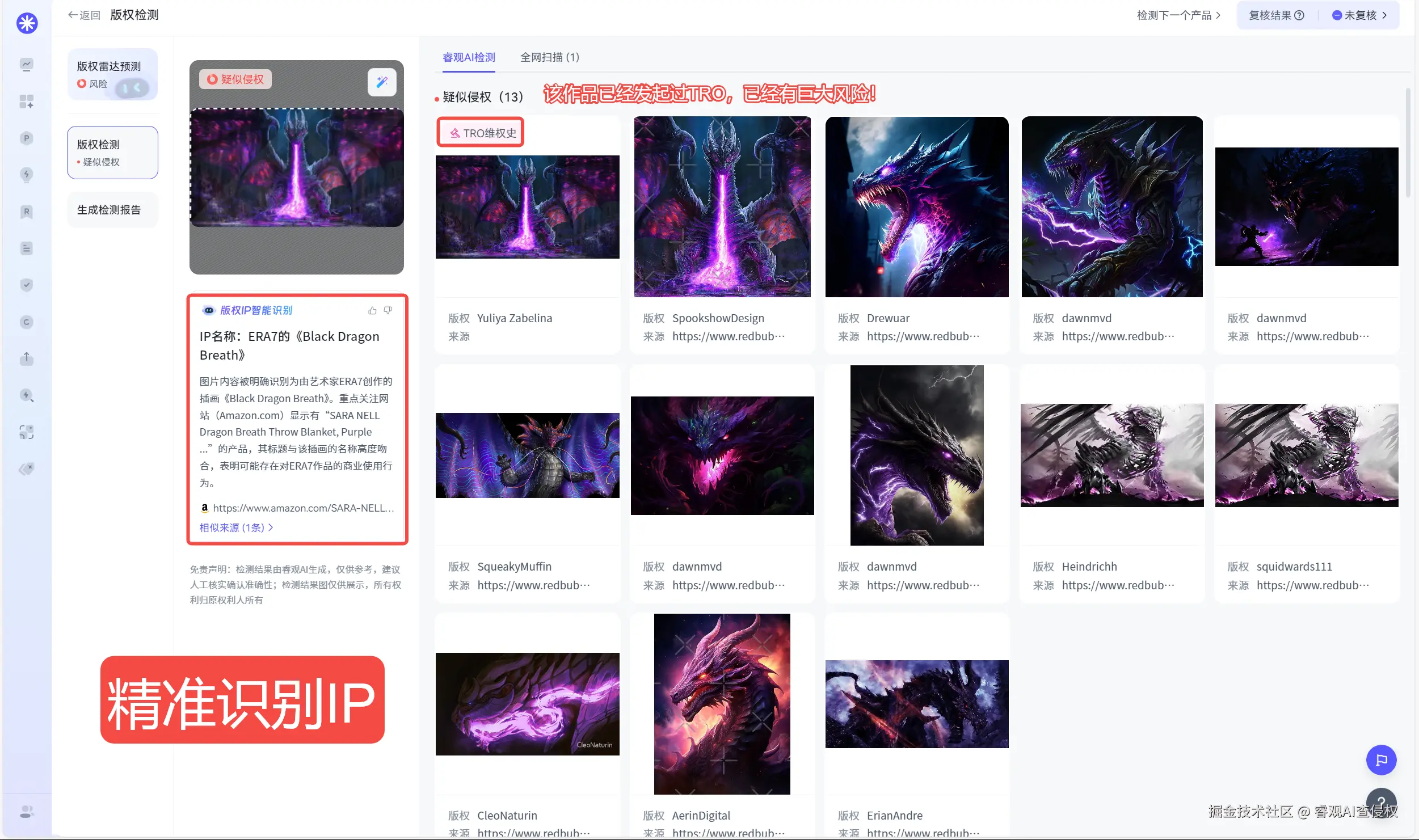 独家自研版权检测功能帮您精准识别知名IP和小众艺术作品,还能标注TRO维权史及权利人