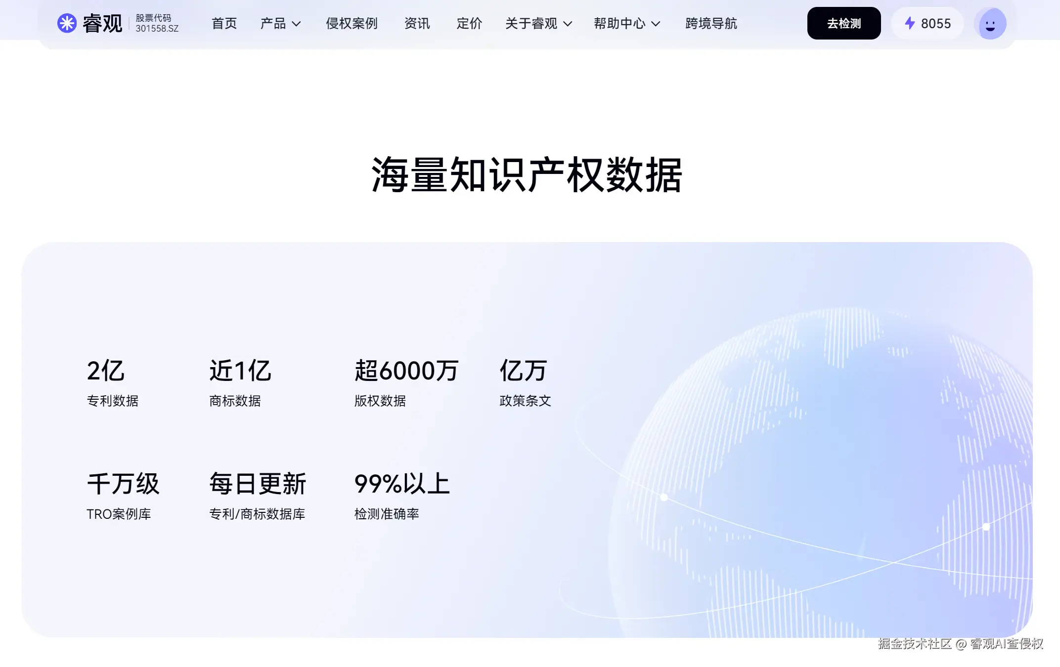 - 2 亿 + 全球专利 / 1 亿 + 商标 / 6000 万 + 版权数据库每日更新,支持图片、文本、产品链接多维度输入,15 秒出全维度检测报告,准确率 99% 以上