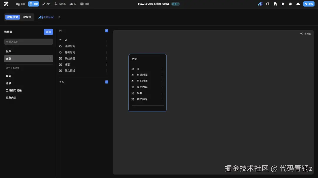 步骤 2:初始存储:添加 存储数据 节点,在 文章 表中创建记录,存入 原始内容 以及 AI 生成的 英文翻译。