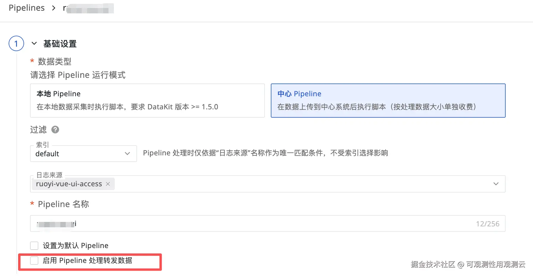 3、需要注意的是,如果需要使用观测云的 Pipeline 解析数据,同时将解析后的字段进行转发,可以使用观测云的中心 Pipeline 脚本:在创建 Pipeline 脚本时,可勾选“启用 Pipeline 处理转发数据”:勾选后,数据先经脚本处理再过滤转存;不勾选则直接转发原始数据。