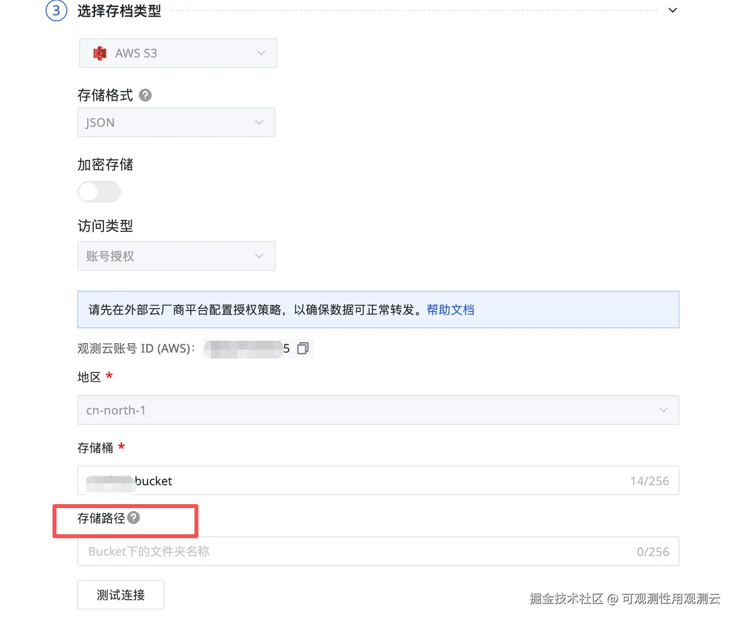 2、路径与优化:仅需在“存储路径”中输入自定义前缀(如guance-log-backup/),系统自动按“工作空间/数据类型/规则名/年月日时”生成完整路径,方便您在对象存储桶中后续的调用和查看。