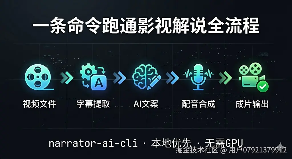 narrator-ai-cli 是一款为命令行和 Agent 时代设计的影视解说工具。pip 安装,无需 GPU,无需本地模型,一条命令跑通字幕提取到成片输出的全流程。