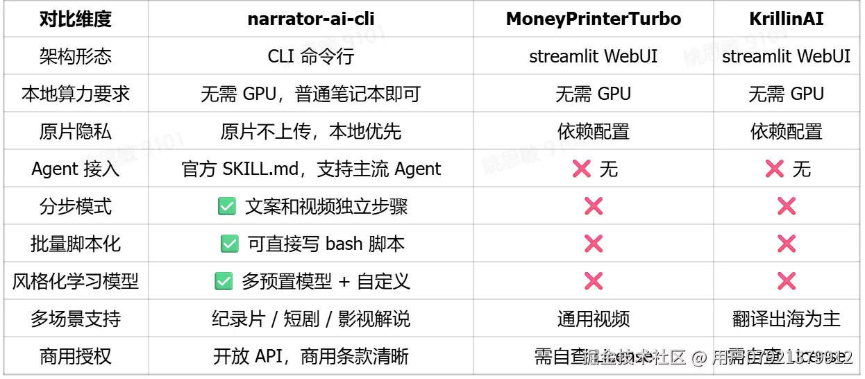 五、narrator-ai-cli 与同类工具的核心差异